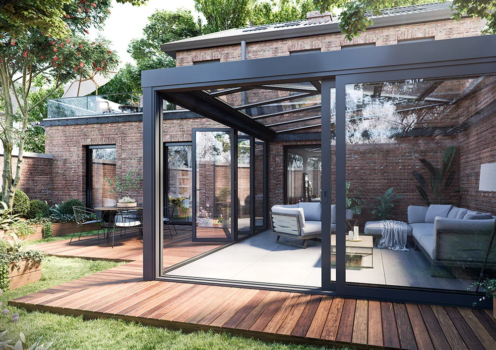 Sunrooms are increasingly popular as multi-use spaces — a spot for relaxing, working, or spending time with family, no matter the weather. Folding glass patio doors make these rooms feel open and breathable, removing the visual and physical barriers between inside and out. On warm days, you can open the entire wall. On cooler days, you still enjoy the view and natural light. And with high thermal insulation, you won’t have to worry about drafts or temperature swings.
